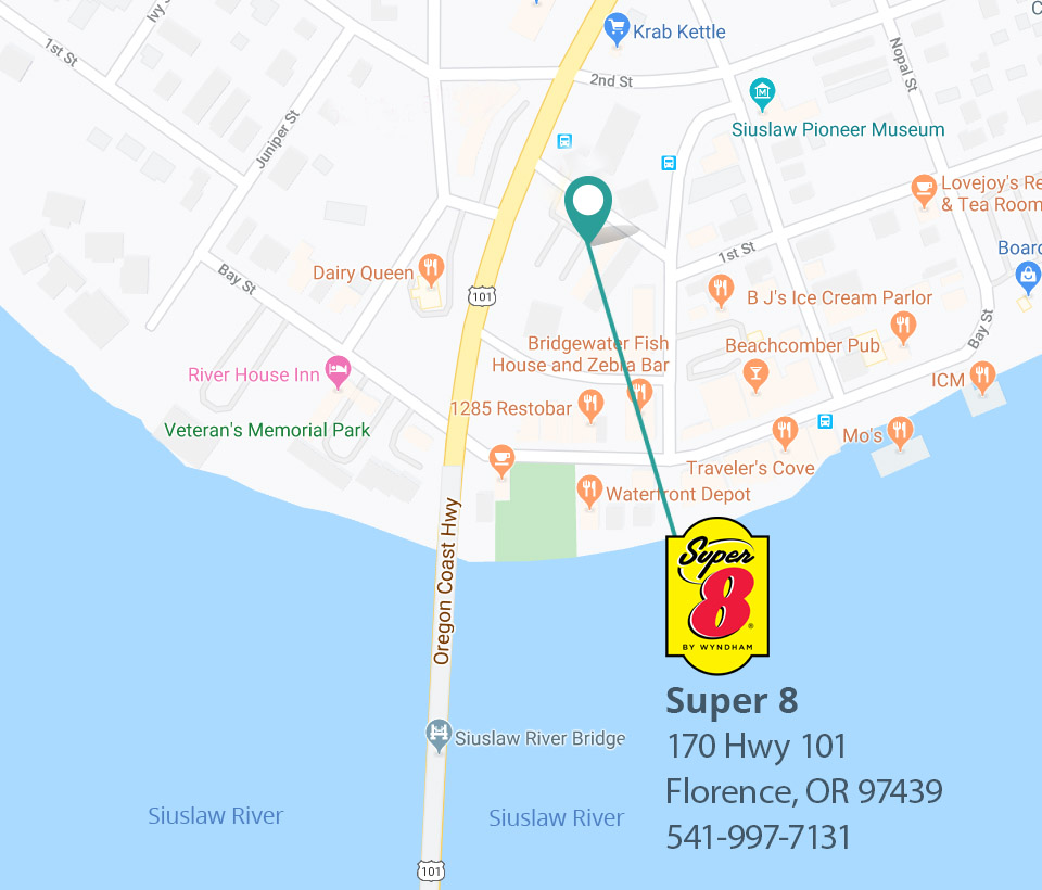 Make the Super 8 by Wyndham Florence OR your home base for discovering the treasures of Florence—Oregon’s Coastal Playground—and the rest of the Central Oregon Coast. Our guests consistently comment on our impeccably clean, comfortable, and convenient rooms; and that we have a friendly, knowledgeable staff who know all the great places to go to make this the epic, memorable vacation you’re looking for. Choose the Super 8 by Wyndham Florence OR for a premier experience among Florence Oregon hotels.